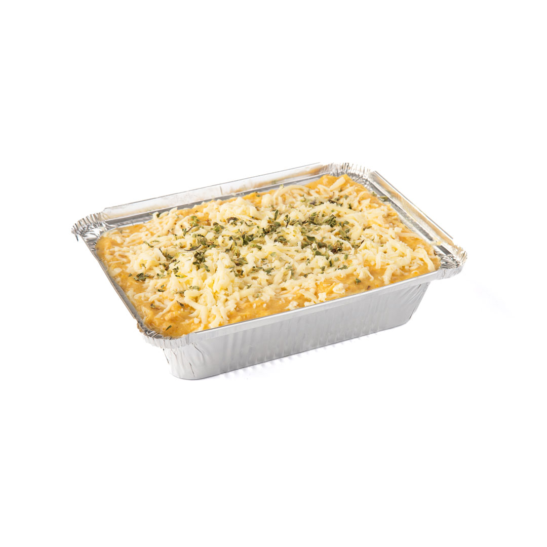 Salsa al pesto con trozos de milanesa y salsa blanca con 3 tipos de queso.